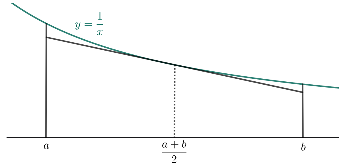 如图1,连接两点 (a,a1) 与 (b,b1) 的弦必在相应曲线段的上方,因此图1中梯形的面积必大于曲边梯形的面积.