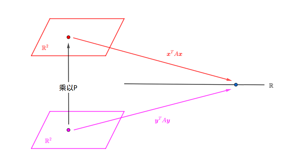 定理中矩阵 P 的列称为二次型 xTAx 的主轴,向量 y 是向量 x 在由这些主轴构造的 Rn 空间的单位正交基下的坐标向量.
