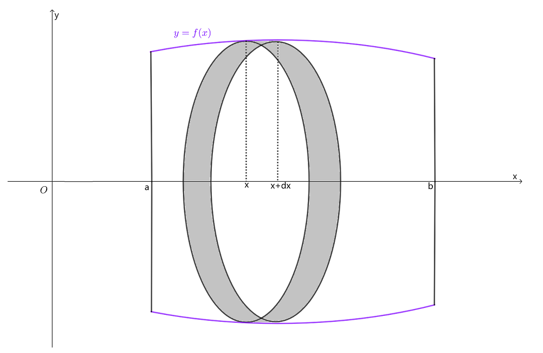 取横坐标 x 为积分变量,它的变化区间为 [a,b] ,相应于 [a,b] 上任一小区间 [x,x+dx] 的窄曲边梯形绕x轴旋转而成的薄片的体积近似于以 f(x) 为底半径、dx 为高的扁圆柱体的体积,即体积元素
